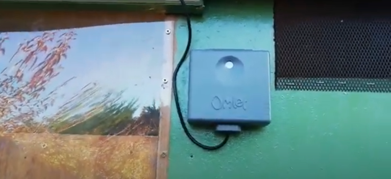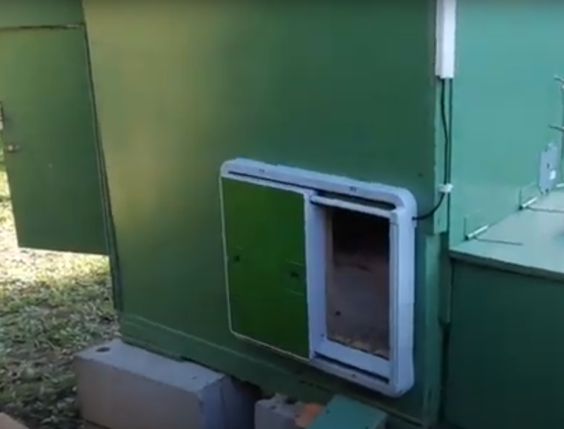Nous avons opté pour la solution d'une porte automatique qui se ferme dès la tombée du jour et s'ouvre toute seule tous les matin grâce à un capteur solaire. Le moteur fonctionne avec des piles et le panneau d'affichage indique le taux de charge. Aucun risque d'oublier de les changer (il faut simplement penser à avoir des piles de rechange).