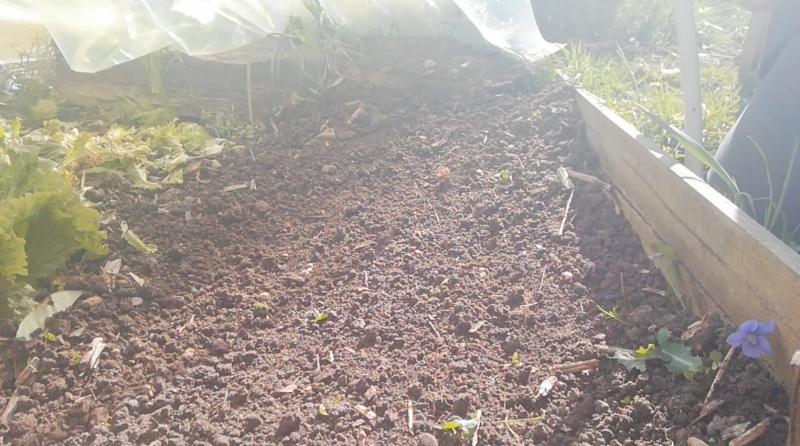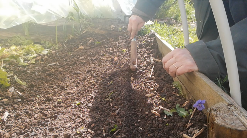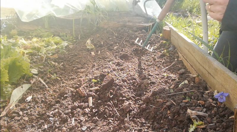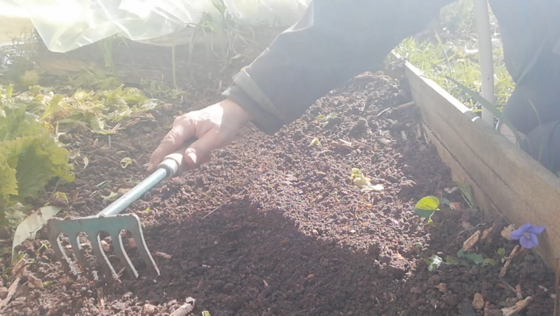 J'affine la terre à l'aide d'un petit râteau ou d'une griffe, j'enlève les cailloux qui se présente devant moi.